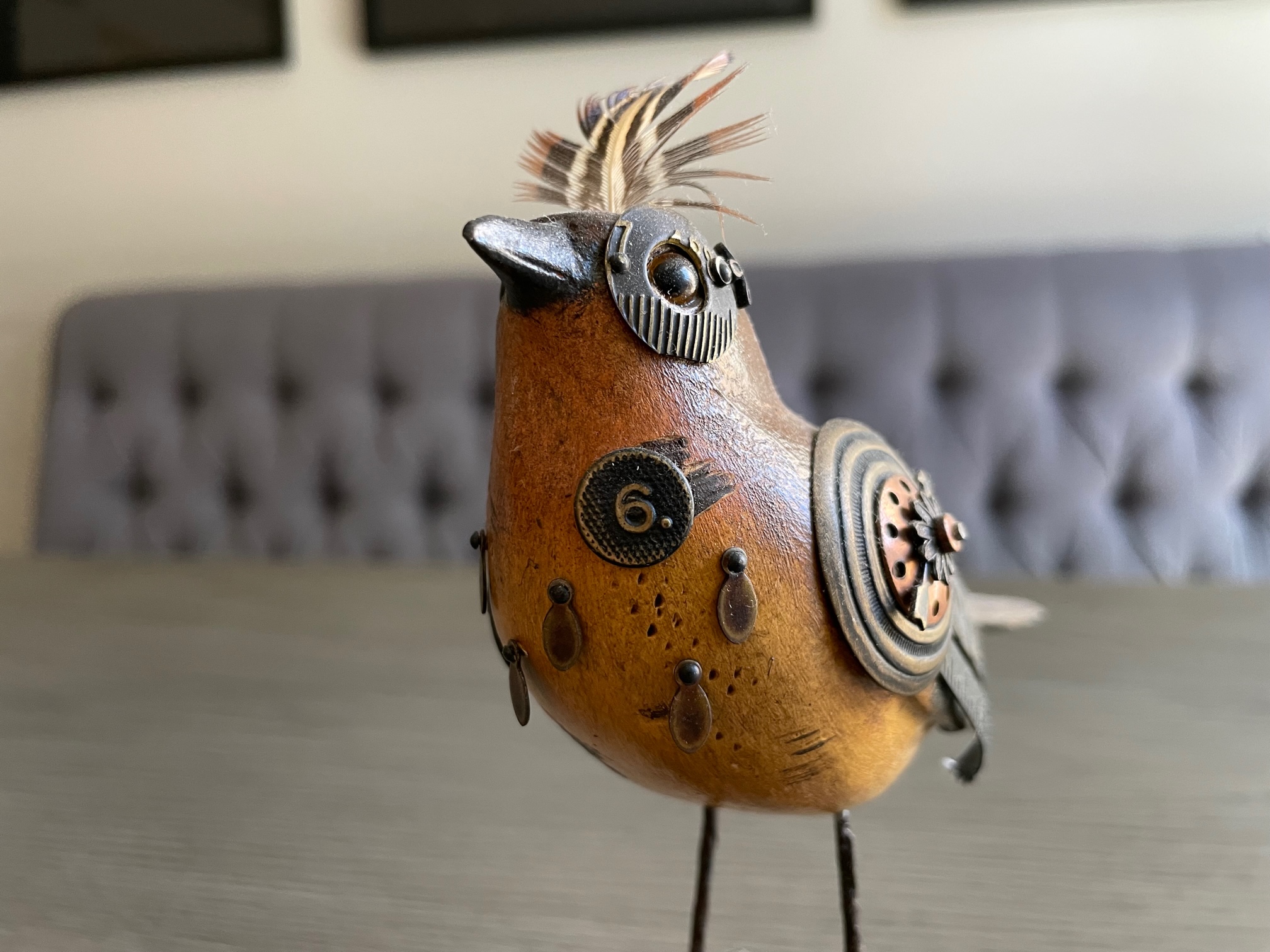 Sometimes the best things come in small packages. Artistry, craftsmanship and the love of nature come together to form this beautifully sculptured, steampunk-esque, songbird. These precious pieces are meticulously crafted by Jim and Tori Mullan, with a mixture of metallic numbers, gears and other curious parts and pieces. And it all works in perfect harmony to give this inanimate object a new song to sing. It’s the beauty of nature reimagined. They have a large body of work with other examples out there, however getting your hands on one can be a bit elusive, as rare birds typically are. We’re on the hunt to add more to our collection, but until then, we will continue to appreciate this wonderful creature of art and nature.